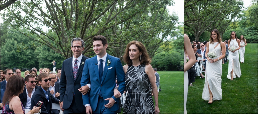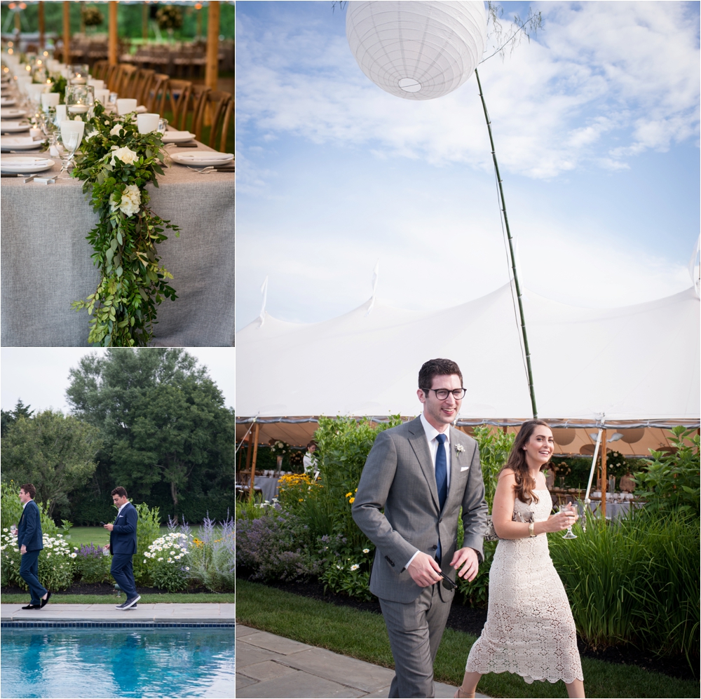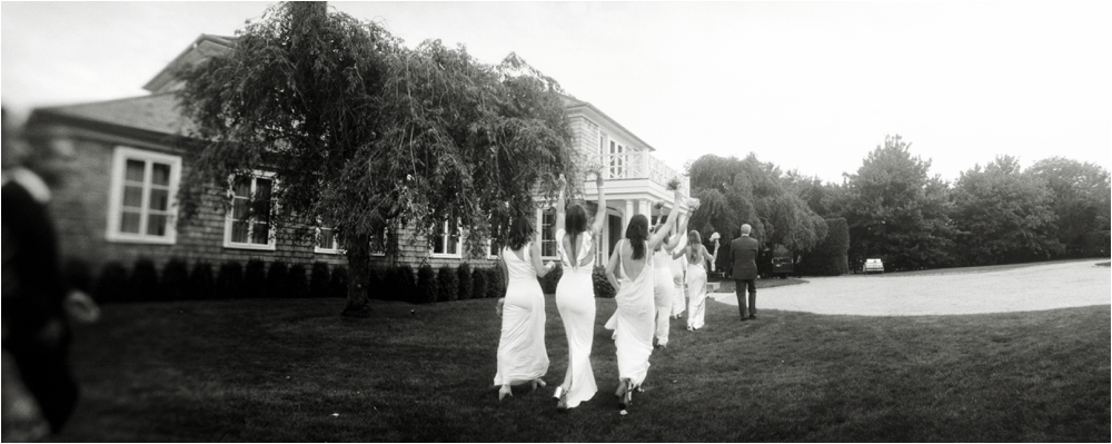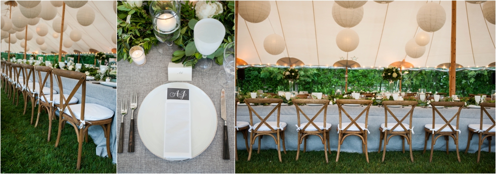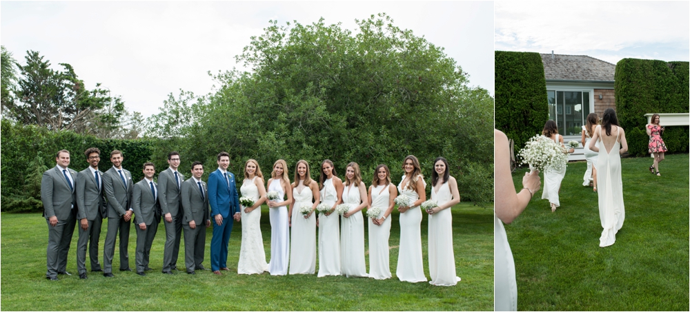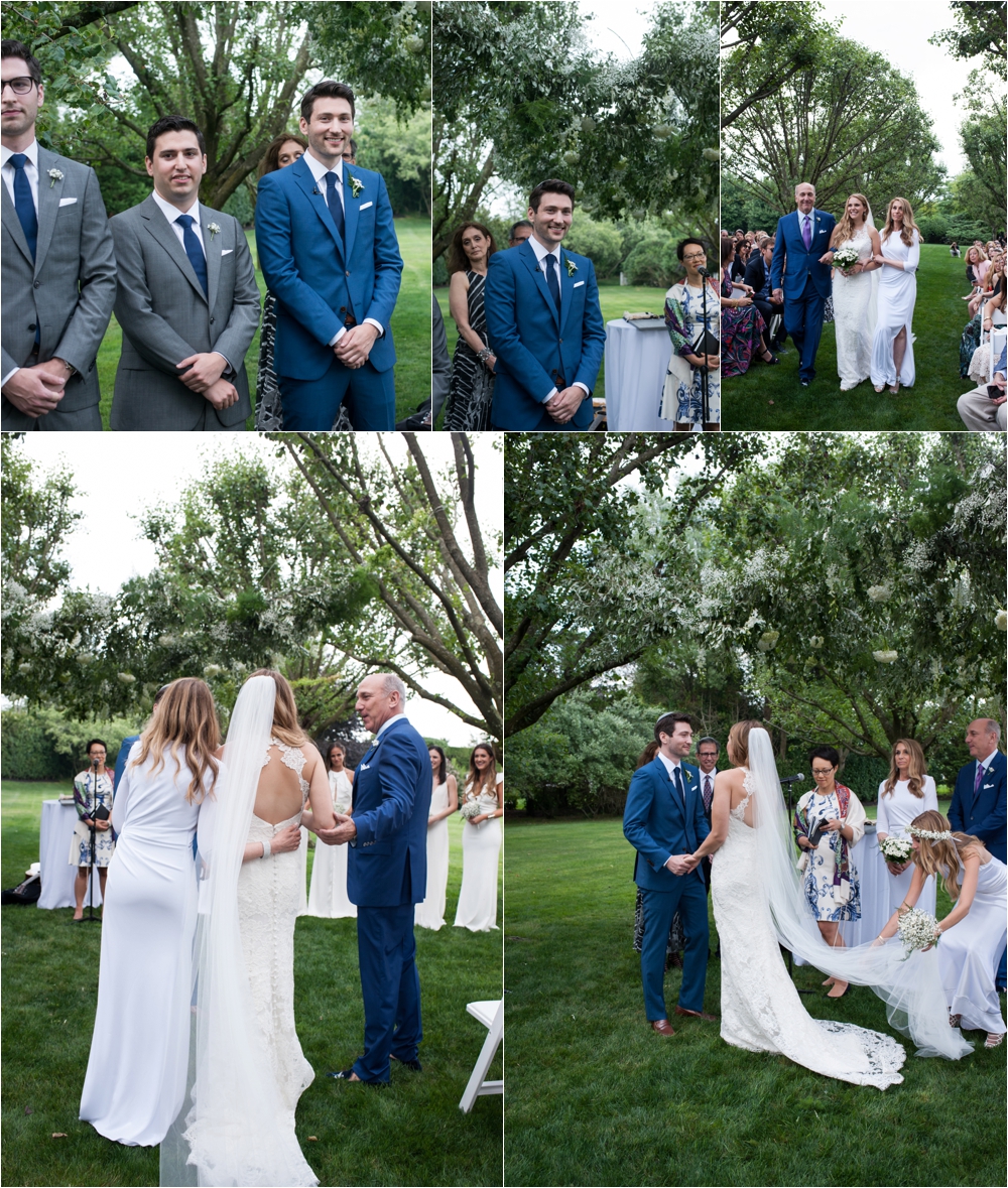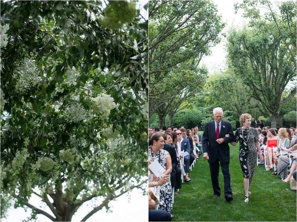Welcome to Ali and Jason’s relaxed backyard affair with a touch of Jay Gatsby, brought to life by Duke and Van Deusen Weddings. Sperry Tents set up one of their signature sail cloth tents at the bride’s summer home in Southampton, NY, Matt Murphy lit the heck out of it with a zillion giant white paper lanterns bride’s summer house, the bridal party rocked it in all white, and Anastasia of Sag Harbor Florist blew us away with her wedding canopy of flowers and branches strung between an aisle of trees.