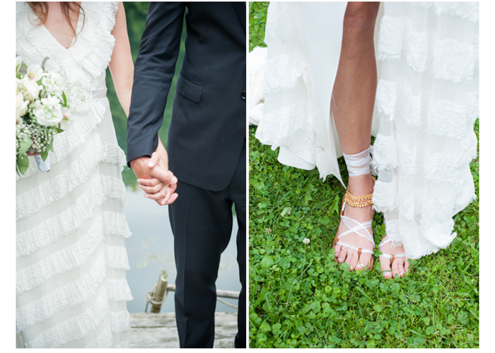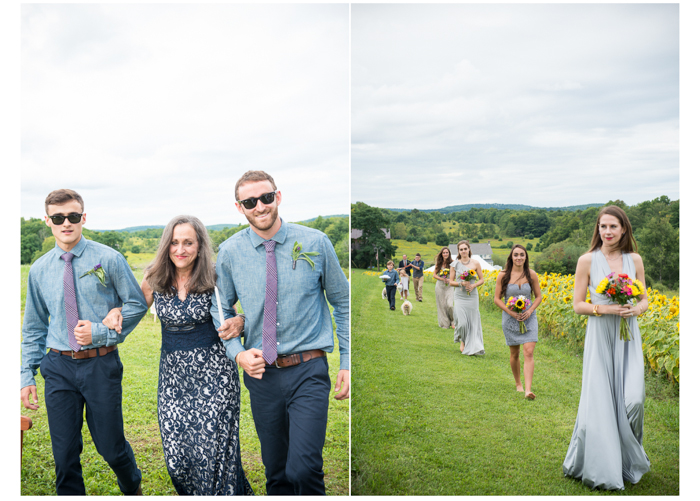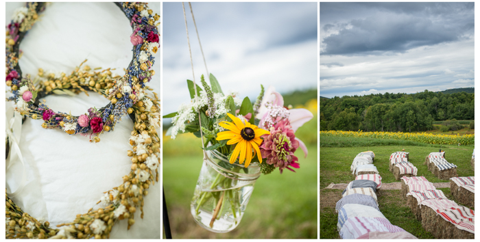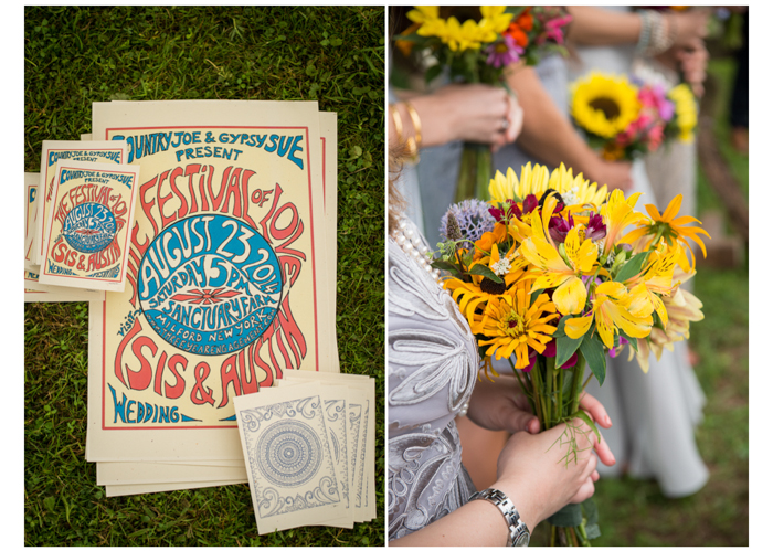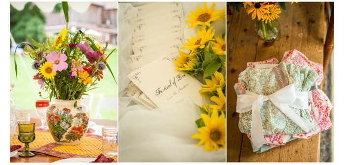 Wow! What can I say about Isis and Austin’s Festival of Love at the bride’s family home in the Catskills. They did it right. First of all, it helps when your Mom is a shoe designer, designs your lace up sandals, and has the phenomenal taste that she does. And it helps when the bride and groom bring Oregon and Cali sensibilities to the table. What a labor of love. The bride’s sister did all the flower arrangements and literally planted the 1/2 mile long sunflower aisle for the ceremony.